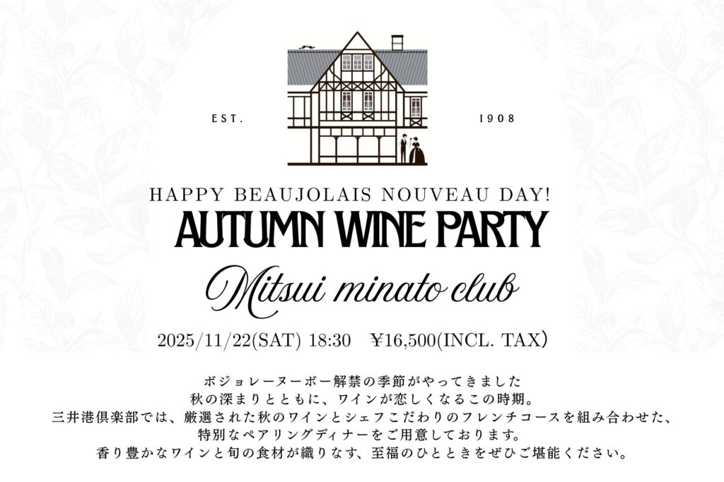 ボジョレーヌーヴォーの解禁週に合わせて、秋にふさわしいワイン会を開催いたします。