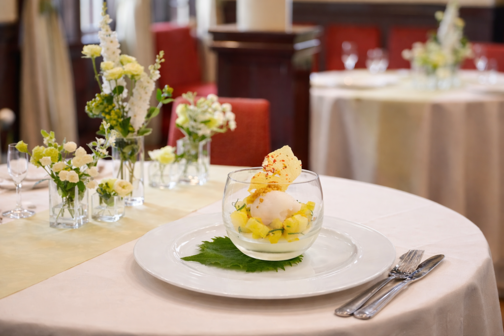 ココナッツのやさしい甘みを生かしたブランマンジェに、ライチの香り豊かなエスプーマを合わせました。青バナナを用いることで食感にアクセントを加え、全体の調和を楽しめる一品に仕上げています。