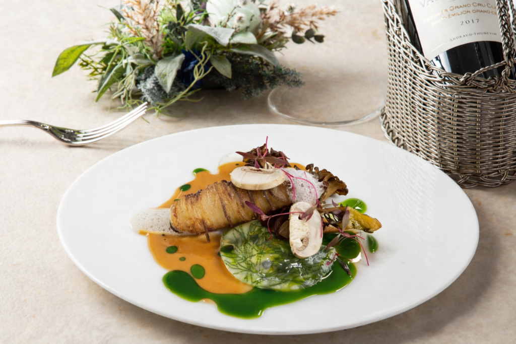 木の芽がふわりと香るバターソース(ブール・ノワゼット)に、瑞々しい春豆を添え、コクのある味わいに爽やかな酸味を効かせています。