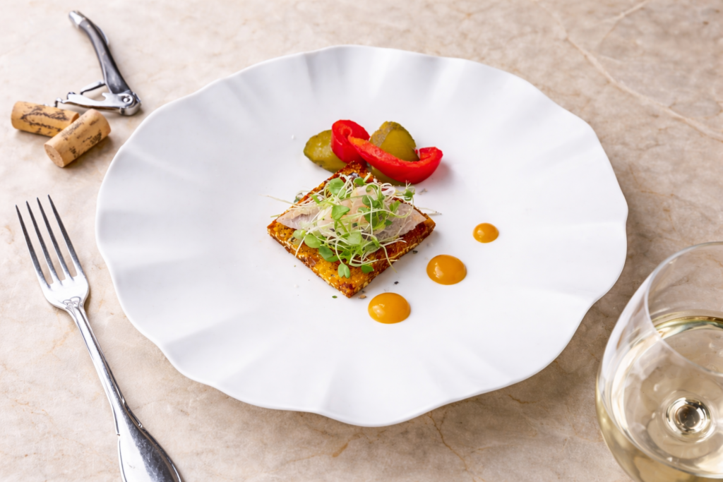 金星佐賀豚のリエットをカナッペ仕立てに。コアントローを煮詰めて香り付けし、カソナードで香ばしく焼き上げたブリオッシュに、自家製の金星佐賀豚リエットをのせ、オレンジの風味を効かせた自家製ピクルスを添えました。アペリティフとの相性を考え、コニャック風味のオーロラソースとともにお楽しみください。